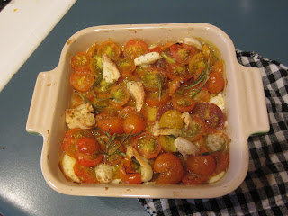 Spread some ricotta cheese in the bottom of a small baking dish. Halve each tomato in a pint of cherry tomatoes. Red, yellow, purple, whatever you have. Throw in a couple of smashed garlic cloves, a few sprigs of fresh herbs, and drizzle the whole mess with a bit of olive oil. Salt. Freshly ground pepper. (A jalapeno if you are Mr. H. I'm not, so no jalapeno here.)