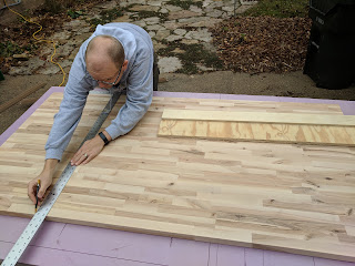It was really big, so it had to be cut down to size. Nate set up the sawhorses with a thick piece of insulation board that he's used for a makeshift cutting table before. We don't have snow on the ground yet and this slab was HEAVY, so he made the call to work on it outside rather than in the basement shop. The fewer stairs with this sucker, the better.